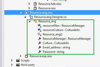 After you built all resx files, you compile the application , and you could see the .cs files corresponding to each resources file in its proper class: